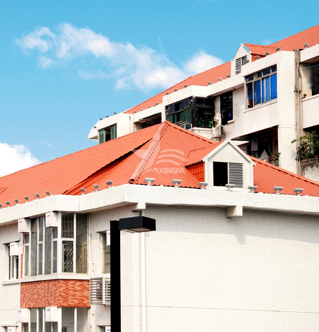 在這些問題區域,雨水會侵入屋頂并進入室內,造成漏水和滲水現象,對修補和維護工作帶來不小的煩惱。然而,傳統的金屬板和水泥砂漿修補方法卻并不能百分之百地保障屋頂不再滲漏!合成樹脂瓦采用高分子材料制成,具有致密的結構且不吸水,有效阻止了滲透現象的發生,從材料本身保障了自身防水功能。即便不添加額外防水層,它也能表現出卓越的防水效果,無需使用繁瑣的水泥砂漿,安裝過程便捷,只需使用自攻螺絲進行固定即可。此外,它還可以根據屋頂形狀進行靈活裁切,搭配專業防水配件進行安裝,為各種節點漏水問題提供了優質解決方案。